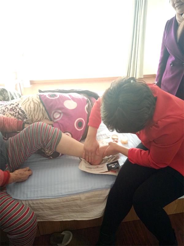 在大连杏林老年公寓,有一位老妈妈在上个月15号左右脚部肿坏非常严重,以至于走路不稳,要依靠拐杖,而且要忍受疼痛。在昨日,来自开发区利来筋骨养护理疗店的李老板带着自己的团队来到我们杏林老年公寓免费为老人理疗脚部肿胀部分。
