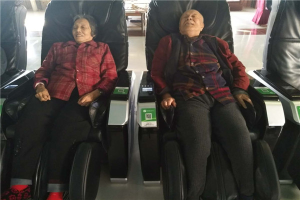 累了坐在按摩椅上按摩休息