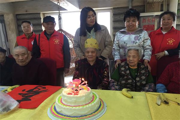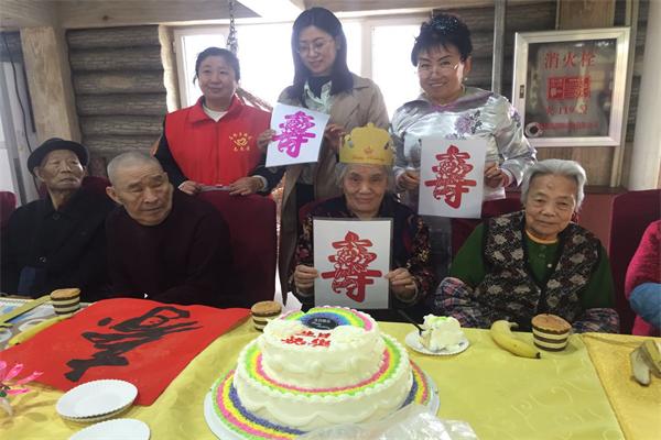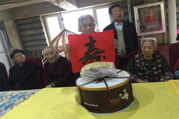 慰问团队给老人祝寿,送上蛋糕和寿字