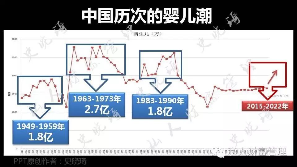 新中国建国以来,经历了3次比较大的婴儿潮,分别是在1949年-1959年,“战后婴儿潮”,出生了1.8亿婴儿;1963年-1973年,“主力婴儿潮”,约出生了2.7亿婴儿;1983年-1990年,“回声婴儿潮”,约出生了1.8亿婴儿;预测在2015年-2022年会因为放开二胎政策而带来一小波“政策婴儿潮”,预计最高年出生婴儿会摸到2000万。