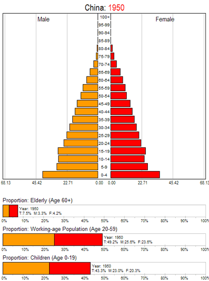 从这个图的动态人口变化趋势明显可以看出,中国早期0-19岁孩子的人口增加,然后是减少,青壮年工作人口在2005年之前不断增加,也就是中国的所谓人口红利阶段,但随后开始减少,然后是60岁以上老年人口大幅度增加,而工作人口和未成年人口大幅度减少。