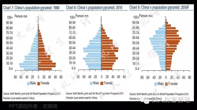 从静态图中可以明显的看出,在1980年时期,中国人口属于“正金字塔形”分布,2010年则变成“橄榄形”分布,预计到2050年,则变成“倒金字塔形”分布!