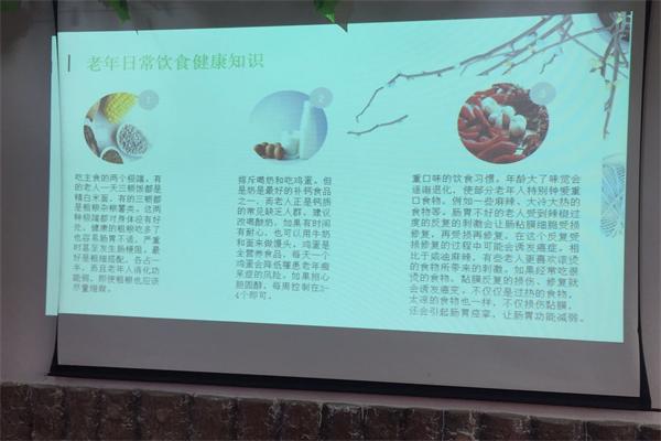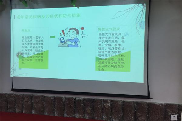 通过这次讲座,让老人更多的了解健康知识,关爱自己,早日预防疾病,早日发现疾病并及时进行治疗,免受病魔的折磨。祝我们的老人及家人身体健康。以下是这次讲座的相关展示图: