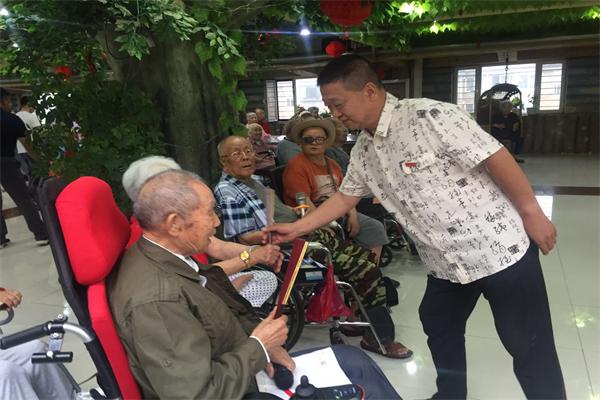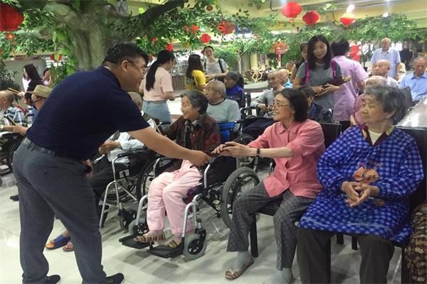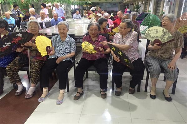 杏林养老产业发展(大连)有限公司董事长为老人分发扇子