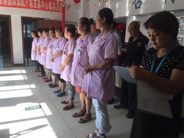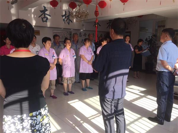 今天是2019年9月2日,星期一。早上八点,杏林老年公寓还和以往一样召开例会。这次例会各部门领导职员全员出席。这次会议由两位院长主持,董事长参加会议。首先由董事长讲话:1、对厨房卫生的肯定,顺利通过市卫生监督局的抽查,并受到表扬;2、天气转凉,要预防老人感冒发生,要给老人熬制姜糖水御寒,防止感冒;3、要注意安全问题,夜间要勤查房、勤巡岗,要到位;4、老护理员要多带带新来的护理员,把护理工作做得更好,把老人照顾好;再由院长对环境卫生做了重点强调,本周主抓卫生和气味,让养老院的环境更上一层楼,让家人放心,让老人在杏林老年公寓安享晚年。