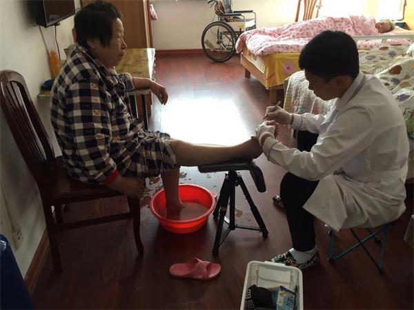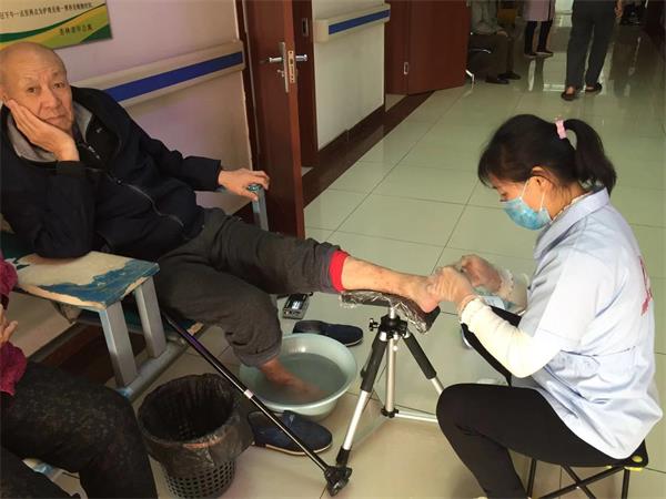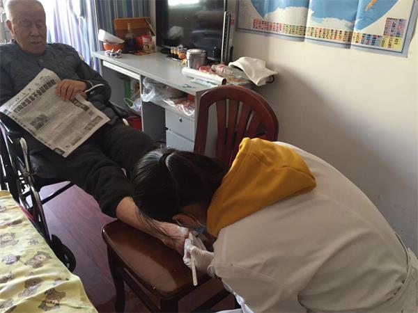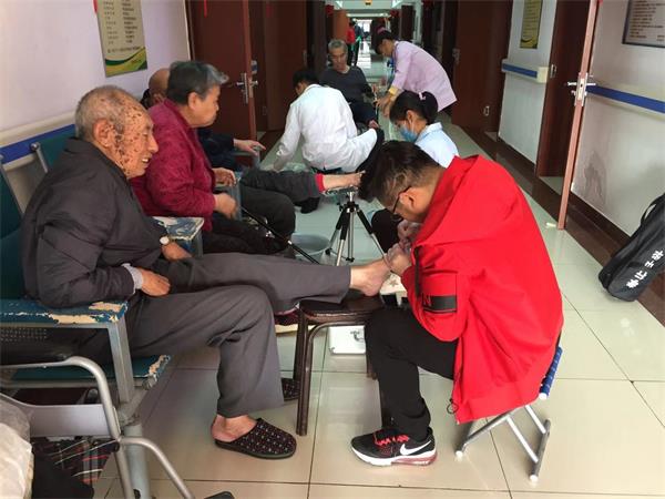 修脚志愿者分配好工作,陆续的开始为老人们修脚。