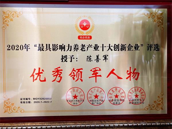 今天又填新佳绩,首先祝贺杏林养老产业发展(大连)有限公司在2020年7月举行的全国最具影响力养老产业十大创新企业评选中被授予优秀示范单位,同时杏林养老产业发展(大连)有限公司董事长陈善军在2020年最具影响力养老产业十大创新企业评选活动中被授予优秀领军人物。