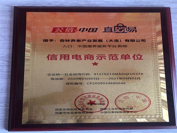 今天值得祝贺的是,经过中国企业信用建设发展联盟政策指导单位和公信·中国管理中心考核评定,授予杏林养老产业发展(大连)有限公司信用电商示范单位,这是对企业在网络商务平台的肯定。现如今,杏林养老产业发展(大连)有限公司不但得到社会的肯定,同时也得了网络平台的肯定。 |