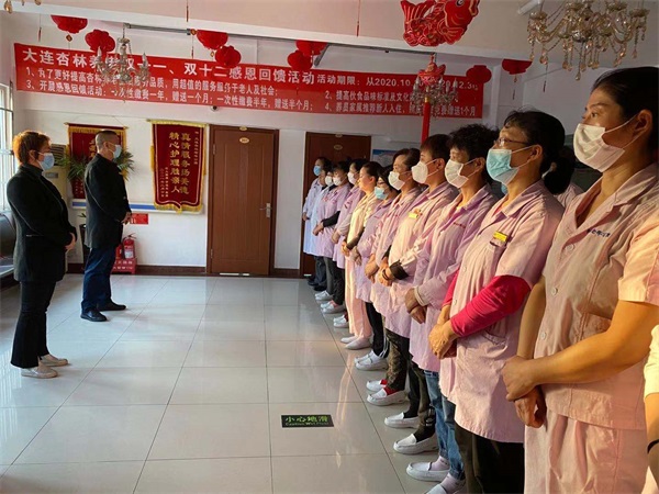 杏林养老产业发展(大连)有限公司董事长陈善军首先强调要为老人提供细致的超值服务,提高服务质量,一如既往地照顾好老人,得到老人和家属的认可。护理员在工作中要理解老人、体谅老人,学会包容、多哄老人开心。护理员要脚踏实地地做好服务,和杏林老年公寓一起不断攀登新高峰。