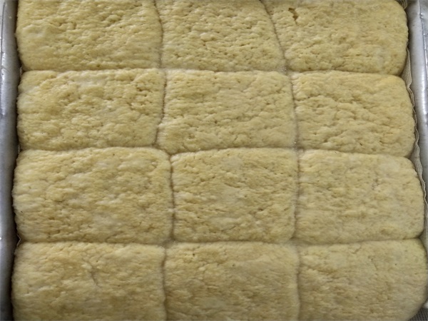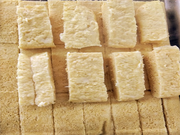 首先在玉米面中加入少量水,搅拌均匀。再团成手掌大小的面饼,放置在铺有屉布的不锈钢餐盘上,在蒸箱里蒸制一小时左右就完成了。最后,先把整盘的玉米面饼子翻个面,再切成小块儿,方便老人食用。