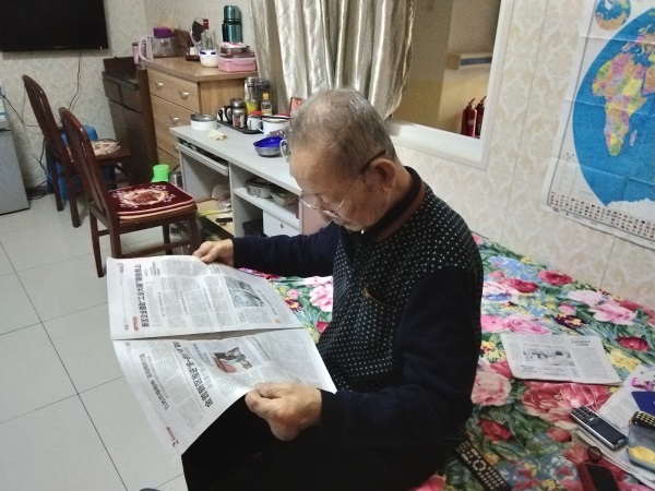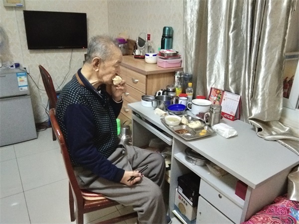 修爸爸每天五点多起床,打开电视看看新闻。到了七点,护理员和食堂工作人员就会把饭送到修爸爸的房间。杏林老年公寓每天早餐都会为老人提供一个鸡蛋,保证充足的蛋白质。八点多,一位老伙伴帮修爸爸捎来一份报纸,修爸爸就戴上眼镜,读起报纸。昨天是杏林老年公寓为老人们煮姜汤的日子,修爸爸很喜欢喝姜汤,护理员就给他盛了一大杯。接着,修爸爸就来到走廊和老伙伴们聊天,一位老伙伴还把自己订阅的杂志《老同志之友》送给他。一直到护理员送来午饭,修爸爸才意犹未尽地回到房间。周二的午餐是包子,食堂还贴心地给老人们配上了蒜酱,修爸爸每吃一口包子都会夹一点蒜配着,吃得有滋有味。吃完饭,修爸爸会睡上一觉。只要平时没事儿,修爸爸就会去坐一会儿按摩椅,一次十五分钟。下午修爸爸会在大厅里转一圈,回到房间后,护理员为他打水泡脚。洗完脚后,修爸爸就坐在床上看新闻,等着吃晚饭。杏林老年公寓的张大夫和修爸爸颇为投缘,晚上经常会来和修爸爸一起聊聊天。修爸爸晚上还会看看新闻,美好的一天既充实又愉悦。