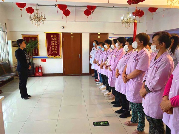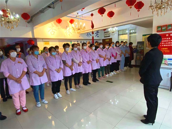 杏林老年公寓郝院长首先强调目前国内外疫情形势复杂多变,需要继续做好封闭管理,老人需要的物品由专人统一购买。护理员需做好日常的消毒、通风,使用消毒液时要注意比例,既要保证效果,又要避免过量以防刺激老人的呼吸道。其次三楼暖气温度较高,护理员需适度调整老人衣物和被褥的数量和薄厚,避免老人患上热伤风。冬季空气干燥,老人需要多饮水,护理员需要给特护老人喂水、把水送到自理型老人手中。最后,本周将进行三天系统的护理培训,增加护理员的专业知识储备。