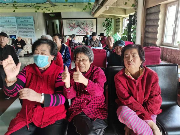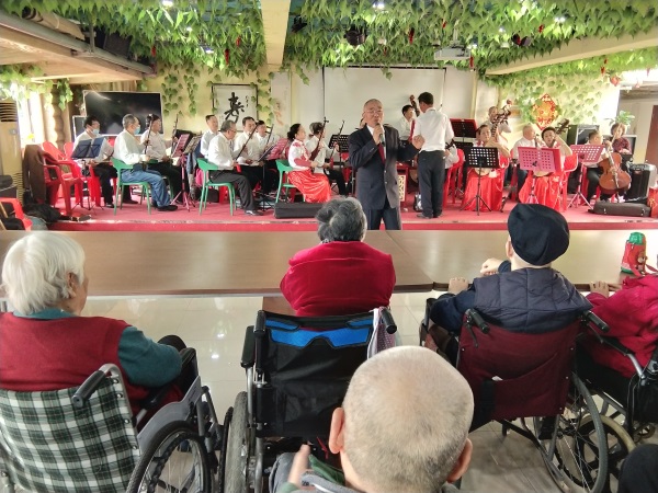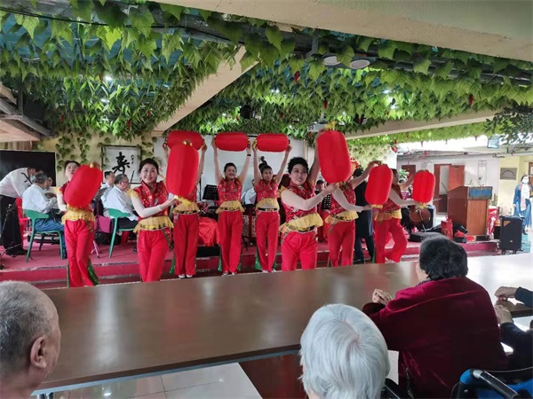 下午两点,赵家春公益演出团的表演准时开始。歌曲、川剧变脸、葫芦丝演奏、京剧《白毛女》选段等精彩的节目引人入胜,老人们看得十分投入,毫不吝惜掌声与赞美。演出团的成员表演歌曲时,与老人们亲切握手互动,老人的脸上露出灿烂的笑容。表演秧歌舞蹈时,演员们来到老人中间,几位老人被欢乐的氛围感染,跟随演员们来到舞台上一起跳起来,十分欢乐。