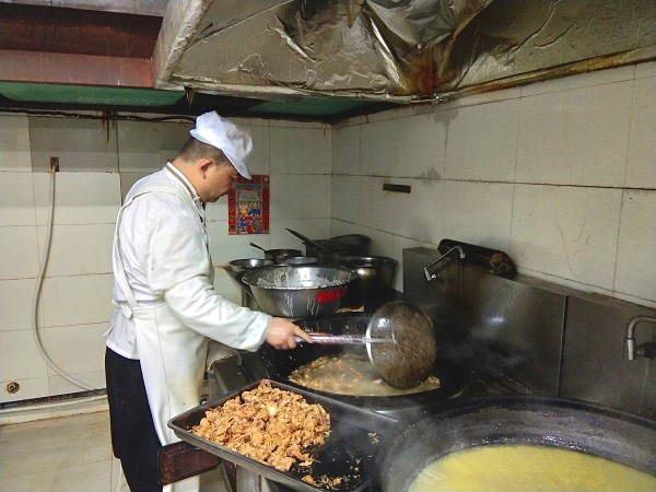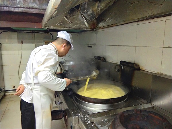 一大早,厨房的工作人员就开始为老人们准备午餐,按照今日食谱制作鱿鱼圈、手撕包菜、咸白菜猪肉炖土豆、汤圆以及主食南瓜馒头、小米粥、玉米面饼子和白米饭。工作人员首先分成两组,一组制作面食,一组准备配菜:鱿鱼切段、调制面糊、包菜撕块、咸白菜切丝、猪肉切块、土豆切条……面食制作完成放进蒸箱时,厨师也开始了菜品的制作:鱿鱼段裹上面糊放进油锅炸制,炸至焦黄酥脆后捞出,两样菜品都炒至熟烂,最后再煮上个大饱满的思念黑芝麻汤圆,今日丰富的午餐就完成了。帮厨们和护理员一起把午饭送到老人房间,让老人准时享用美味。