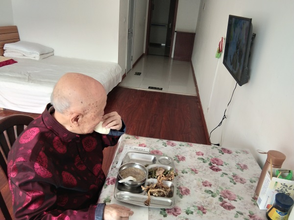 杏林老年公寓309房间的钟爸爸出生于1928年,现今93岁的钟爸爸依旧精神矍铄,乐观开朗,每天读书看报,开心时还会唱起歌来。