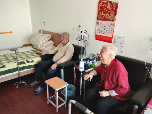杏林老年公寓352房间的安妈妈性格乐观开朗,虽因脑出血造成行动不便,短距离需借助步行器,远距离则乘坐电动轮椅,但安妈妈对自己的身体恢复状况十分满足,每天脸上都洋溢着笑容,和人交谈时也总是以笑声结尾。