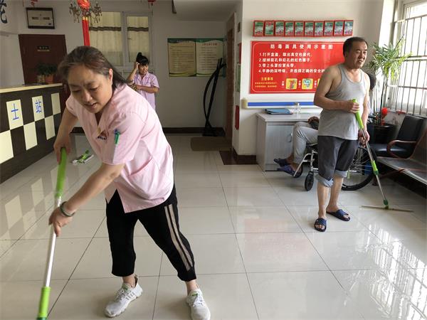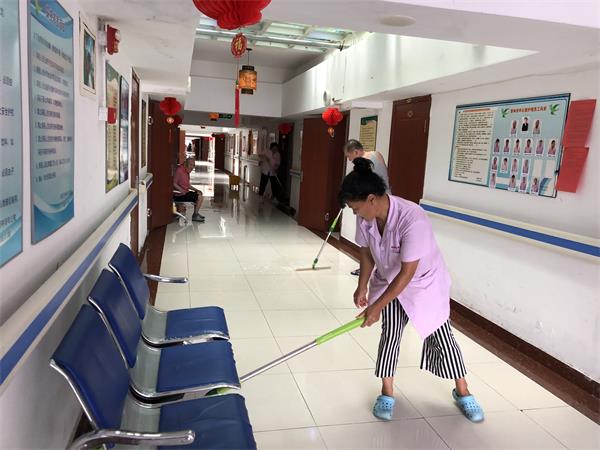 在这里杏林老年公寓的护理员会每周定期打扫卫生,会用水泼到地上然后先拖一遍之后用刮板在刮一遍最后再拖一遍,这是每周护理员都会做的事情,会让老人有一个干净的舒适的地方居住。