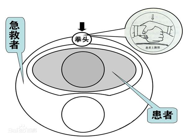 首先将双臂分别从患者两腋下前伸并环抱患者,左手握拳,右手从前方握住左手手腕,使左拳虎口贴在患者胸部下方,肚脐上方的上腹部中央,形成“合围”之势,然后突然用力收紧双臂,用左拳虎口向患者上腹部内上方猛烈施压,迫使其上腹部下陷。这样由于腹部下陷,腹腔内容上移,迫使膈肌上升而挤压肺及支气管,这样每次冲击可以为气道提供一定的气量,从而将异物从气管内冲出。施压完毕后立即放松手臂,然后再重复操作,直到异物被排出。
