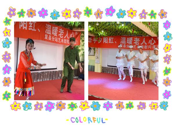 复县站艺术团的演出在上午开始,以《开场舞》和《诗朗诵》拉开帷幕,节日的欢乐氛围顿时弥漫开来。一曲舞蹈《毛主席的光辉》,将演出现场的气氛推向了高潮;复县站艺术团常年坚持做公益慰问演出,走遍大连地区多家养老院和文化广场,给大家带来欢乐。