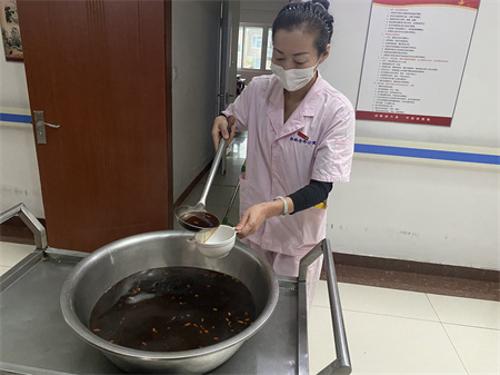 护理员把熬制好的姜汤,送到每一位老人手里,喝上一碗热乎乎的姜汤,有祛寒邪之疗效,加强老人的自身防护,防止感冒发生。老人们喝着姜汤即暖心又开心。