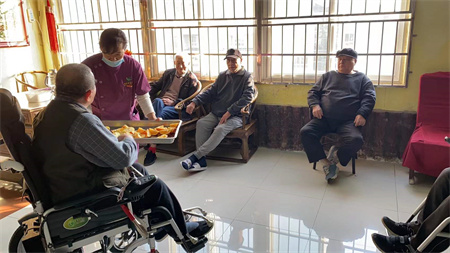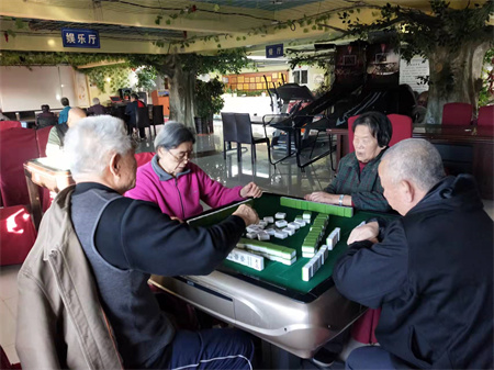 现在因为是冬季老人不能下楼,所以把活动日改成室内,活动就在四楼活动大厅进行,这里宽敞明亮,温暖的阳光透过透明的玻璃顶棚和窗户洒进来,照得老人们暖洋洋的。老人们就这样一边舒服地晒着太阳,一边享受着休闲的娱乐时光。