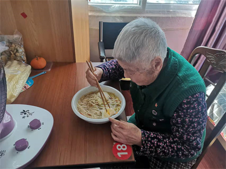 在杏林老年公寓,每位老人生日时都会有工作人员送来蕴含着长寿祝福的长寿面,长长的面条配上两个荷包蛋,代表了我们对老人健康长寿的真挚期盼。
