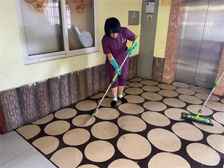 杏林老年公寓每周都会刮地,会用水泼到地上然后先拖一遍之后用刮板在刮一遍最后再拖一遍,这是每周护理员都会做的事情。