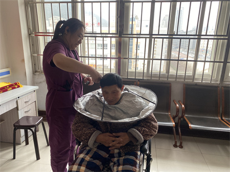 杏林老年公寓为半自理和特护老人提供定期理发和指甲修剪服务,保证老人都能保持整洁的仪容,年纪大了也要美美地享受幸福的晚年生活。为了给老人们理发,杏林老年公寓的护理员们都练就了一身好手艺。杏林老年公寓的护理员们虽不是专业的理发师,但为许多行动不便的老人免去了出行的麻烦,老人们每次理发后都精神焕发,格外清爽。许多老人因年轻时在工作中受伤或其他原因指甲变厚变硬,护理员们也会仔细耐心地帮老人修剪好。