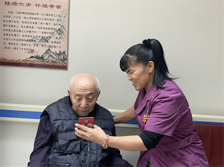 这次清明节赶上疫情,现在因为疫情,养老院处于封闭管理时期,家属禁止来院看望老人,护理员禁止回家,所有人都呆在养老院里,不准外出。儿女现在不能来看望老人,也十分想念,所以用护理员的手机给儿女发视频聊天,让老人心里安心,也让家属放心。