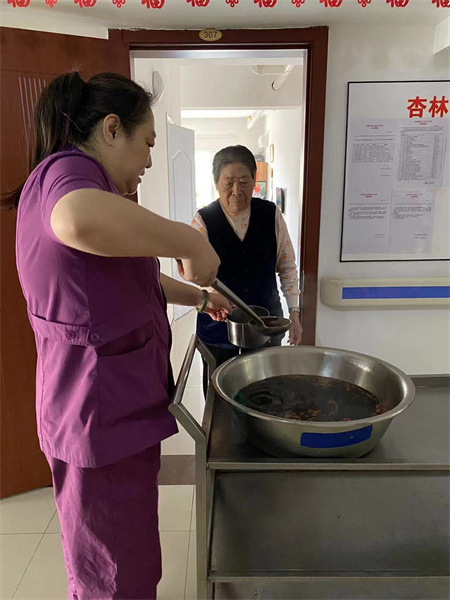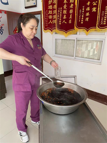 护理人员亲自给老人送上一碗姜糖水