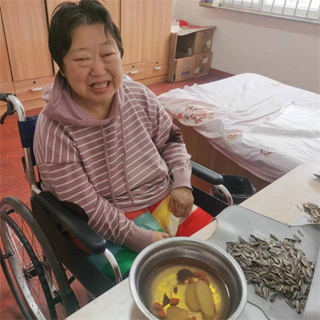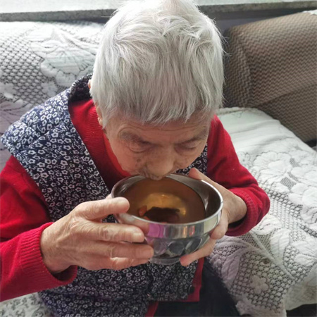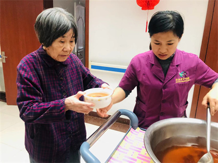 杏林老年公寓每天都会给老人打一碗热腾腾的姜汤水,姜汤可以提神补气,发汗解表,可用于治疗感冒、头晕、烦躁及神经衰弱等病证;姜汤具有温中止呕,温胃散寒的功效,可以起到暖胃的作用,可用于缓解胃寒引起的腹痛、腹胀、腹泻等症状。夏季喝姜汤,还可以促进唾液分泌,增强肠蠕动,起到促进食欲的功效;姜汤中含有的姜辣素有抗氧化作用,能够清除体内自由基,起到抗衰老的作用。
