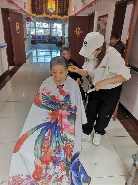 她们每个楼层,有的老人不方便行走,她们都会来到老人的房间门口,来给老人理发,也不会嫌弃我们老爸老妈。