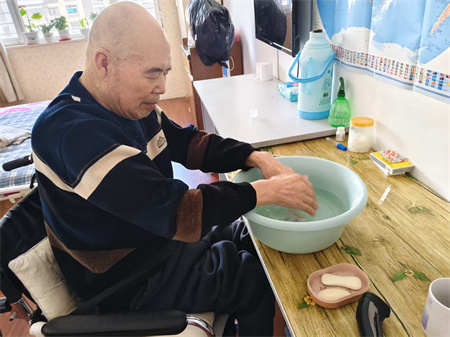 在杏林老年公寓,老人们的一天是从护理员清晨送上的一杯温水开始的。早上七点,工作人员准时把早饭送到老人房间。上午,护理员还会帮老人打扫房间,给老人送去热水。下午,老人们午休结束后,护理员会给老人打来热水泡脚。除了日常护理外,护理员还会定期为老人理发、修剪指甲、洗澡、洗衣服、清洗床品……对卧床的老人,护理员还会定时帮助其翻身,防止产生褥疮。我们会精心照顾每一个老人,就算是在老年公寓也会让他们享受在家的感觉。