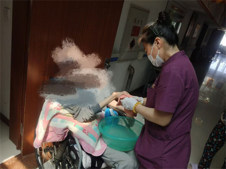 2. 照护洗脸:擦拭方法:从鼻子、耳朵的周边、脖子、下巴的下方的顺序擦拭,皱纹的褶皱也不要错过。要用毛巾干净的部分擦拭。